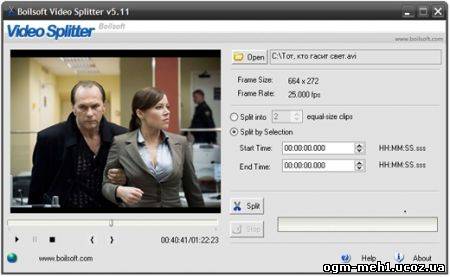 Boilsoft Video Splitter - инструмент позволяющий вам порезать большой видеофильм на несколько более маленьких частей или небольшие клипы. Программа поддерживает: AVI, Divx, MPEG-4, MPEG-1, MPEG-2, ASF, WMV, WMA и другие видео форматы. Встроенный проигрыватель позволяет с точностью до секунды или фрейма выбрать начало и конец фрагмента, а встроенная функция разбиения видео файла на равные части или по определенному размеру поможет вам быстро и удобно нарезать ролики без потери качества. Программа имеет простой и дружелюбный интерфейс, поддерживает работу с файлами больше 2GB и отличается от большинства высокой скоростью работы.