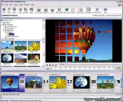 Программа для создания фото и видео слайд-шоу (или заставок), позволяющая применить около 300 эффектов перехода между изображениями, а также добавить звукововое сопровождение. С одной стороны, ProShow Gold - программа очень простая в применении (поддерживается drag-and-drop), с другой - обладает множеством полезных возможностей, начиная с автоматической синхронизации времени проигрывания музыкального сопровождения со временем показа слайд-шоу до очень удобной записи созданного проекта на DVD и VCD.