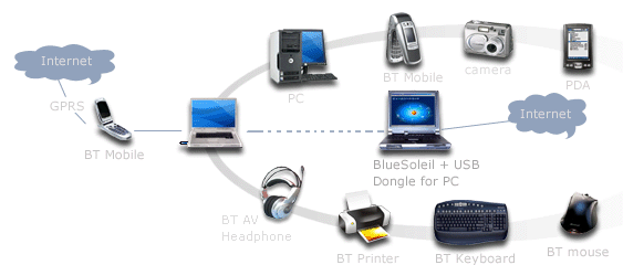 IVT BlueSoleil поддерживает: 1. Передачу VOIP данных; 2. Передачу файлов; 3. Передачу картинок; 4. Виртуальный COM порт; 5. Передачу стерео звука; 6. Эмуляцию HID устройств (клавиатуры, геймпада или мыши); 7. Поддержку сотовых и мобильных телефонов (возможно использовать встроенную камеру, как Web-камеру); 8. Организацию локальной сети и расшаривание интернета И др...